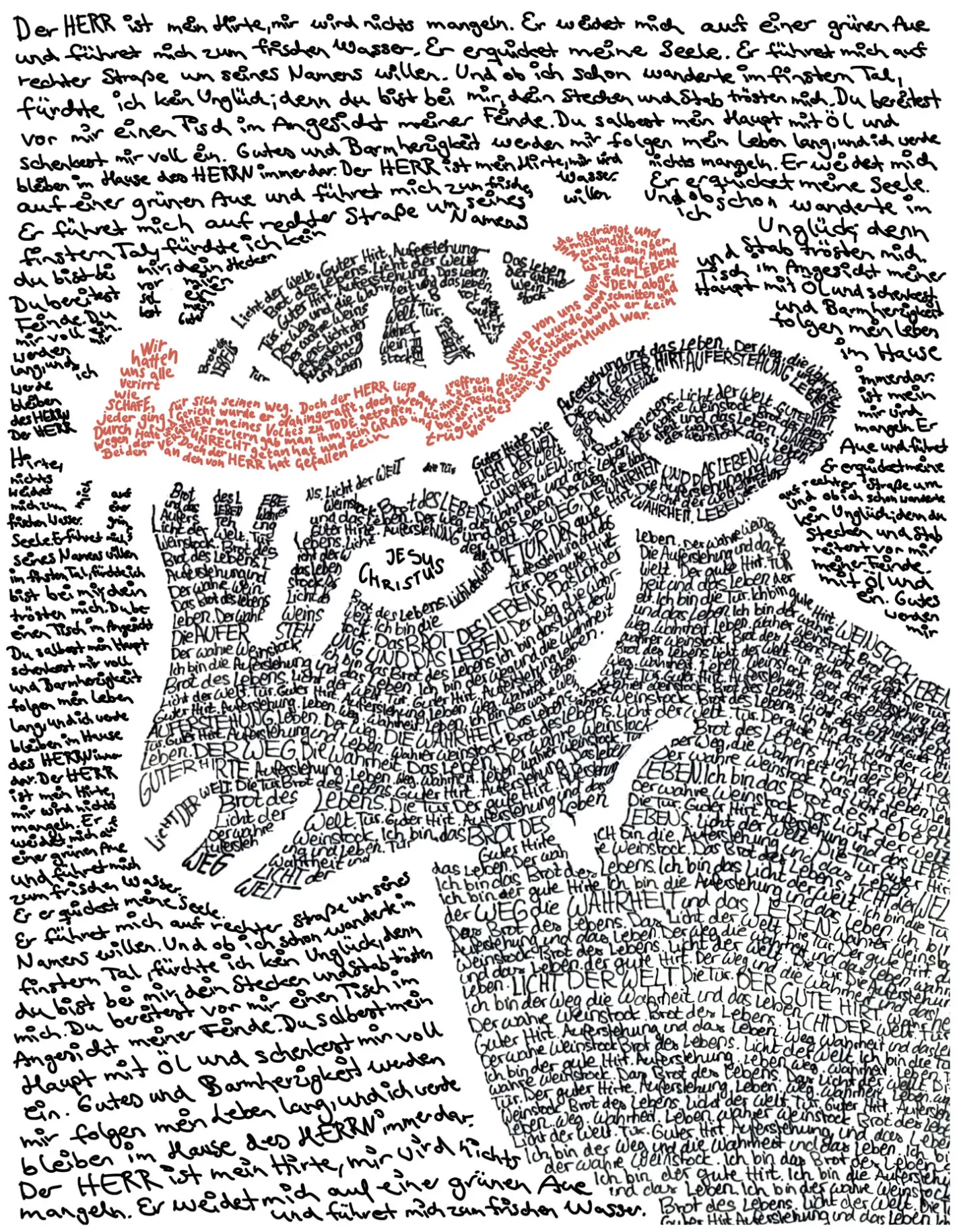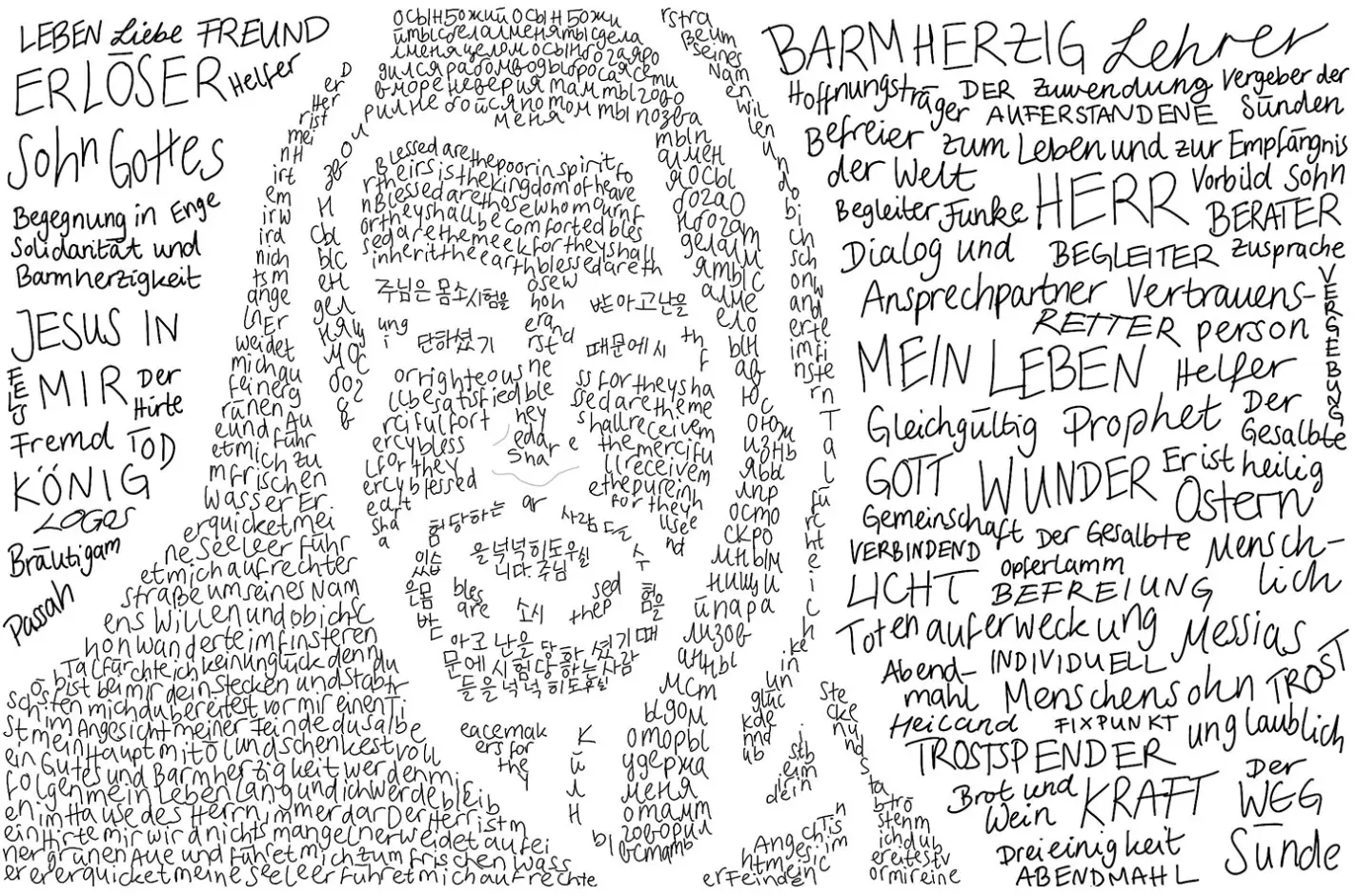 Der Ausgangspunkt unserer Arbeit war das Bild des gesichtslosen Jesus im Bild „Le Repas“ des Künstlers Olivier Christinat. Da der Künstler eine Darstellung gewählt hat, die sich nicht auf äußere Merkmale festlegt, haben wir uns in der Gruppe auch dafür entschieden. Wir haben uns gefragt, welche Eigenschaften Jesus für Menschen haben kann. Die Begriffe haben wir genutzt, um das Gesicht von außen zu formen. Es sind unsere individuellen Zuschreibungen, die wir von außen an Jesus herantragen. Die Worte, die innerhalb der Jesusdarstellung stehen, stammen aus Psalmen, Liedern und weiteren Zitaten aus der Bibel. Da wir als Gruppe unsere Wurzeln in unterschiedlichen Ländern haben, haben wir diese Zitate in den Sprachen dieser Länder verfasst: deutsch, englisch, koreanisch und russisch.