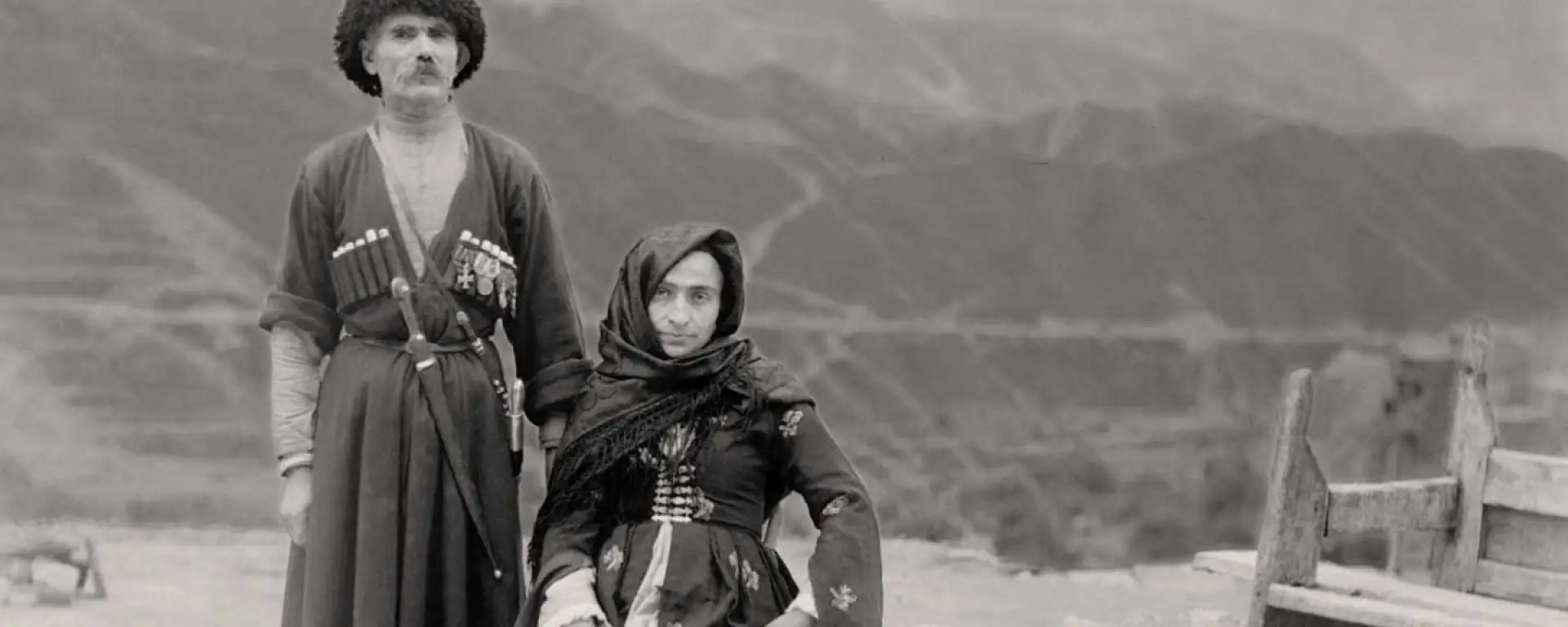 Ein Mann und eine Frau sitzen in traditioneller Kleidung für eine Porträtaufnahme vor der Bergkulisse des Kaukasus in der Nähe von Gunib (Dagestan) auf Stühlen. Der Mann hat einen schwarzen Schnurrbart und trägt eine schwarze Schafspelzmütze und ein anthrazitfarbenes Hemd unter einem weißen Wollkaftan. Im Brustbereich sind mehrere angenähte Brusttaschen zu sehen, in denen sich Pistolenpatronen mit silbernen Spitzen befinden. Zusammengehalten wird der Kaftan von einem Gürtel, an dem sich rechts ein gebogener Säbel (Šaška) befindet. Mit seinen Händen umfasst er einen langen Dolch. Er erweckt den Eindruck, dass er jederzeit bereit ist, seine Waffe aus der Schwertscheide zu ziehen. Die Frau trägt ein grau-grünes Kopftuch. Sie stützt sich mit beiden Händen auf ihren Knien ab. Unterhalb ihres Kopftuches ist ein geblümtes Kleid zu sehen. Insgesamt wirkt die Frau sehr angespannt, was sich an ihrem ernsten Blick und der Haltung ihrer Hände ablesen lässt. Im Hintergrund der Fotografie ist das Panorama einer Berglandschaft zu erkennen. Das Paar scheint sich auf einem Berg des Gebirges zu befinden.