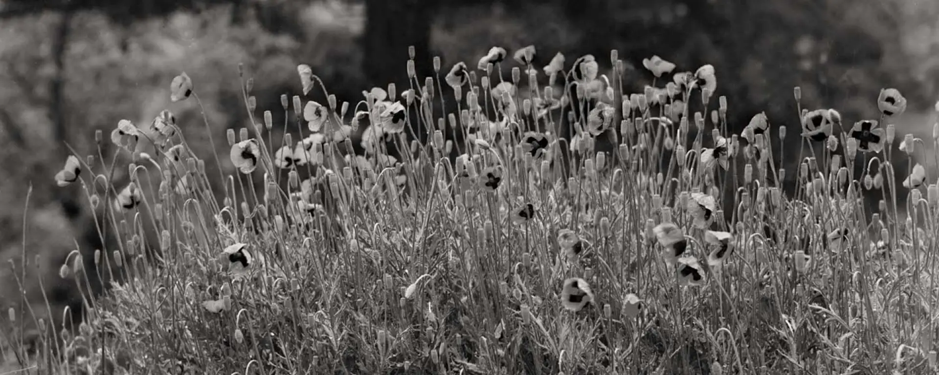Die Fotografie mit den Mohnblüten präsentiert eine idyllische Szene, bei der im Vordergrund eine üppige Wiese mit wilden Mohnblumen zu sehen ist, während im Hintergrund hochgewachsene, dunkelgrüne Bäume emporragen. Das Bild fängt den Betrachter ein, indem es eine harmonische Balance zwischen den kräftigen roten Mohnblumen und dem satten Grün der Bäume schafft. Es ist offensichtlich, dass es zum Zeitpunkt der eher langen Belichtung windstill gewesen sein muss, da die Blütenblätter der Mohnblumen ruhig und unberührt verweilen. Das Bild zeigt eine wilde Landschaft in ihrer ursprünglichen Schönheit. Die Abwesenheit von menschengemachten Strukturen und Spuren verstärkt das Gefühl von Unberührtheit.