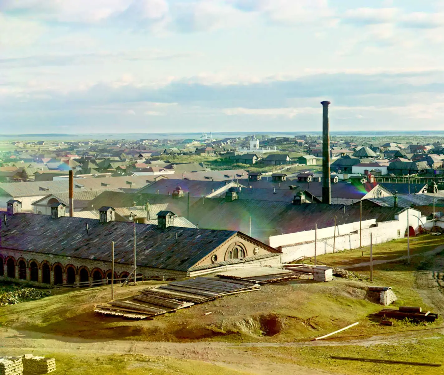 Bild 3: Bild eines Werks in Zlatoust nahe Čeljabinsk im Südural. Im Hintergrund das Taganaj-Massiv. Man erkennt, dass das Glas auf einer der drei Glasplatten gesprungen ist; in der Projektion bzw. Digitalisierung entsteht hierdurch ein Farbartefakt.