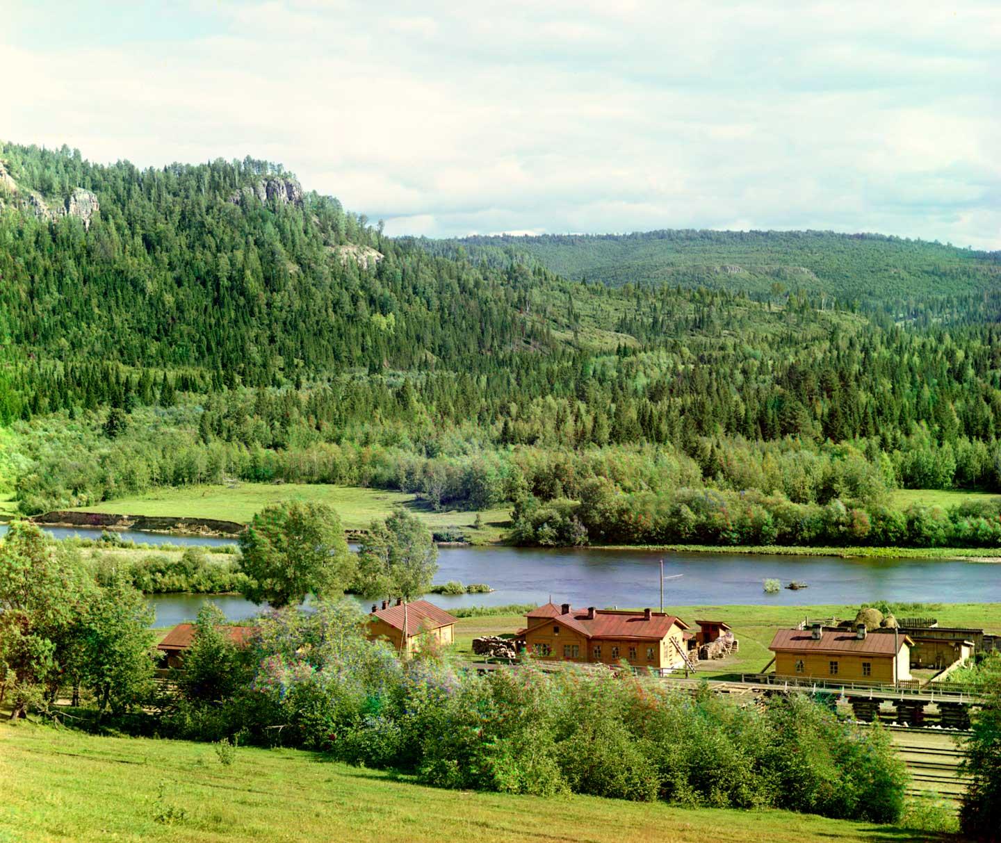 Bild 1: Landschaft im Uralgebirge. Das Bild ist ein Beispiel für Prokudin-Gorskijs häufiges Fotografieren mit großer Schärfentiefe. Diese Art des Fotografierens kam zugleich den recht langen Belichtungszeiten entgegen: Landschaften nahm Prokudin-Gorskij oft aus der Ferne auf, was den Effekt von Bewegungen im Bild minimierte.