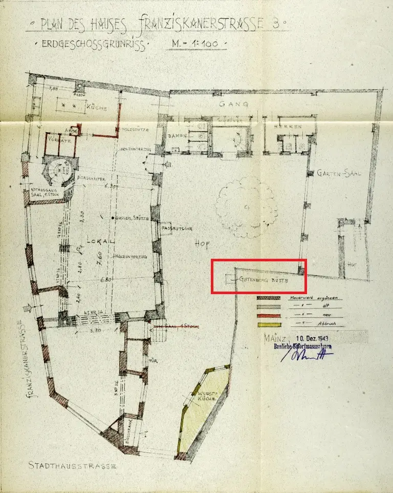 und bedeutete übersetzt etwa „Dieses Denkmal wurde zur Erinnerung an Johannes Gutenberg, Erfinder der Druckkunst, Johann Fust und Peter Schöffer, seine Mitstreiter, errichtet, die in diesem Haus „zum Jungen“ gewohnt und das erste Druckhaus eingerichtet haben.“ Die Rechtschreibfehler haben wir ganz oberlehrerhaft einmal rot markiert (TYPOGRAPHICAE, SCHÖFFERO PRIMIS, ERECTUM müsste es heißen).