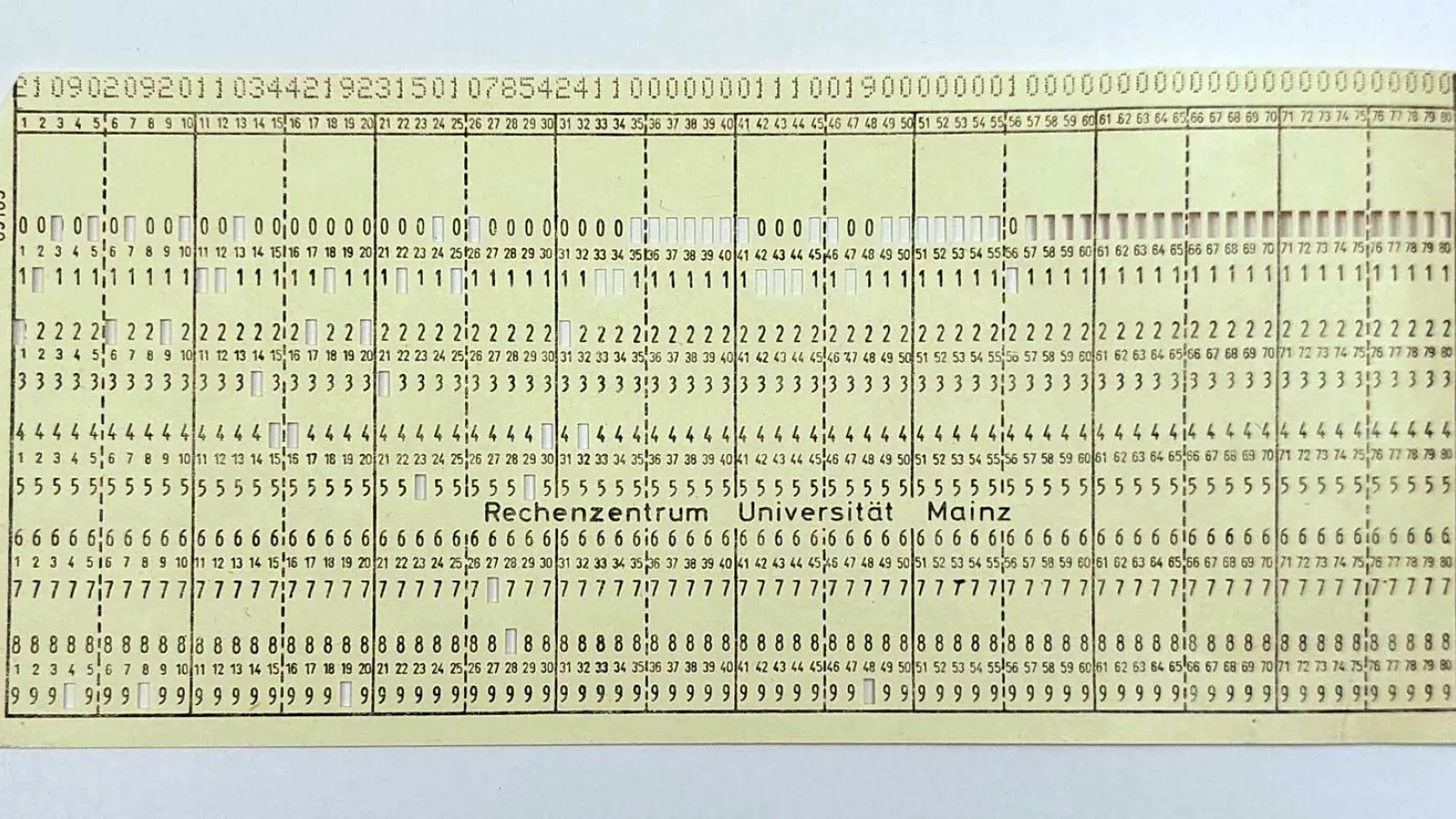 Lochkarte des Rechenzentrums der Universität Mainz, Karton, 8,2 cm x 18,5 cm, Universitätsgeschichtliche Sammlungen, JGU
