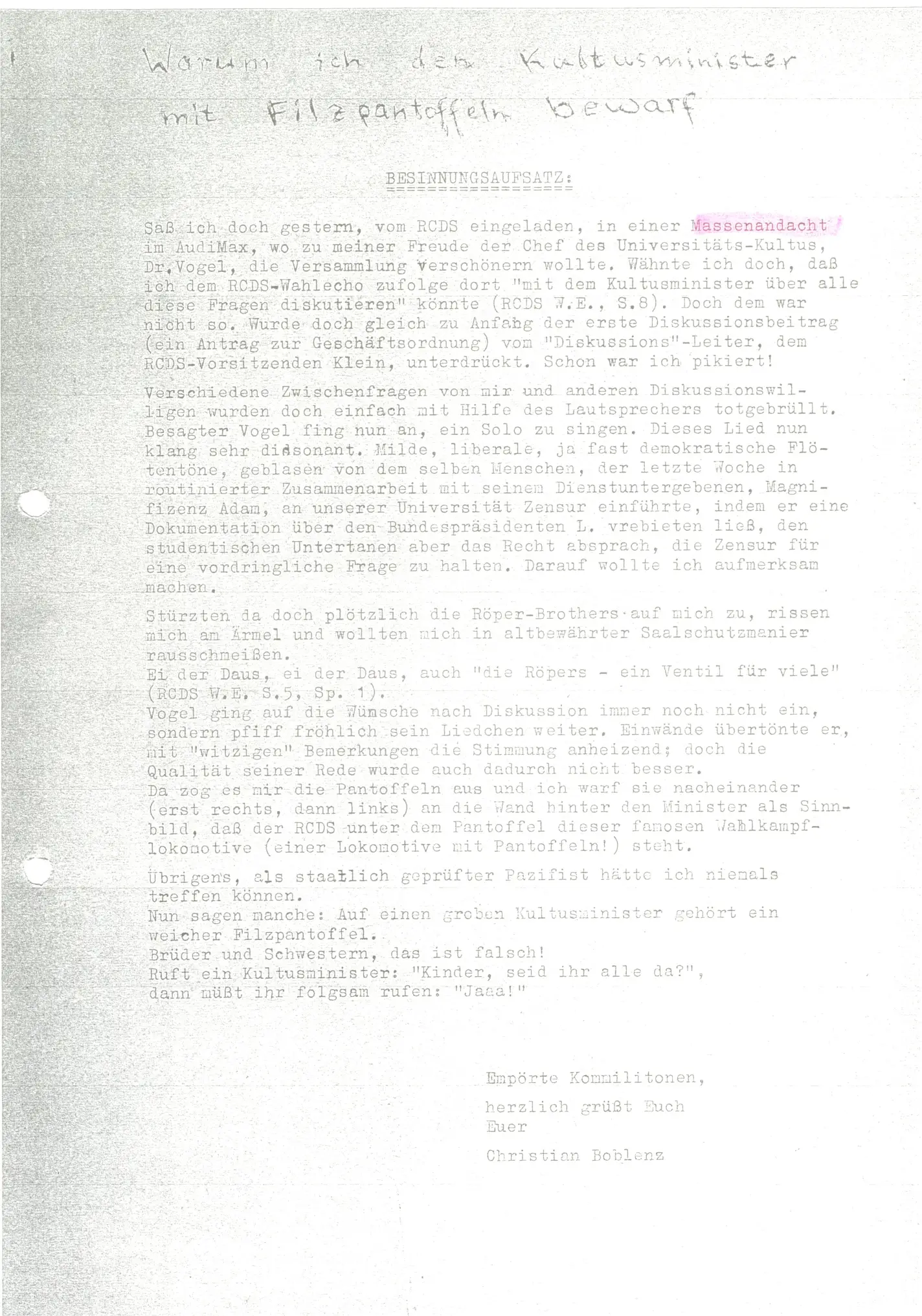 Flugblatt mit einem "Besinnungsaufsatz", in dem sich Christian Boblenz zur Tat bekennt.