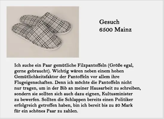 Empathische Schuhliebhaber werden nun zu Recht fragen, was mit den Pantoffeln passierte. Nun, diese waren der Höhepunkt des kurz darauf folgenden Balls der Nation am 27.01.1968. Dort präsentierte man in der ersten Auflage der „Miss Uni“ nicht nur die schönste Studentin des Campus, sondern versteigerte auch die skandalträchtigen Schlappen meistbietend. Nachdem dem FDP-Landtagsabgeordneten Günter Storch die Pantoffeln aber nur 12 Mark wert waren, wanderte das Paar für 21 Mark in unbekannte Liebhaberhände.